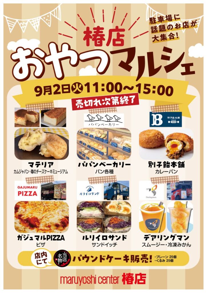 2025.09.01 お知らせ (9/2)【愛媛/松山】マルヨシセンター椿店に出店! この度松山市のマルヨシセンター椿店にて開催される「椿店おやつマルシェ」に出店します。 カリットカリー他商品をお持ちしますので、この機会にぜひお越しください。