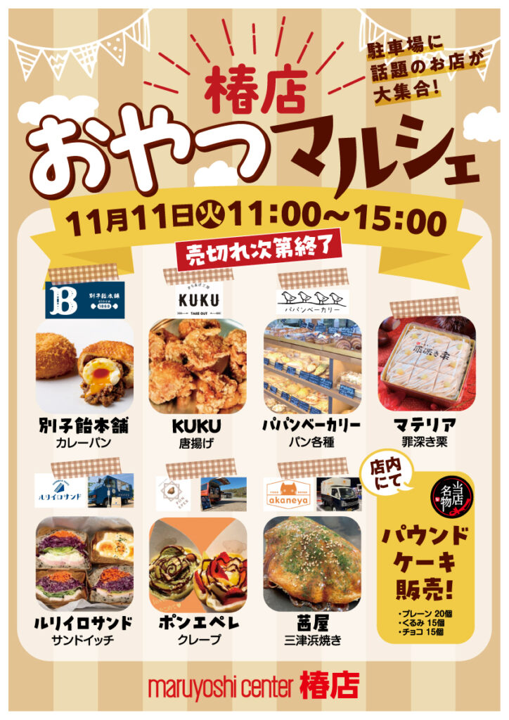 2025.11.07 お知らせ (11/11)【愛媛/松山】マルヨシセンター椿店おやつマルシェに出店! この度、松山市にあるマルヨシセンター椿店「おやつマルシェ」に出店します。 カリットカリー他商品をお持ちしますので、この機会に是非お立ち寄りください。