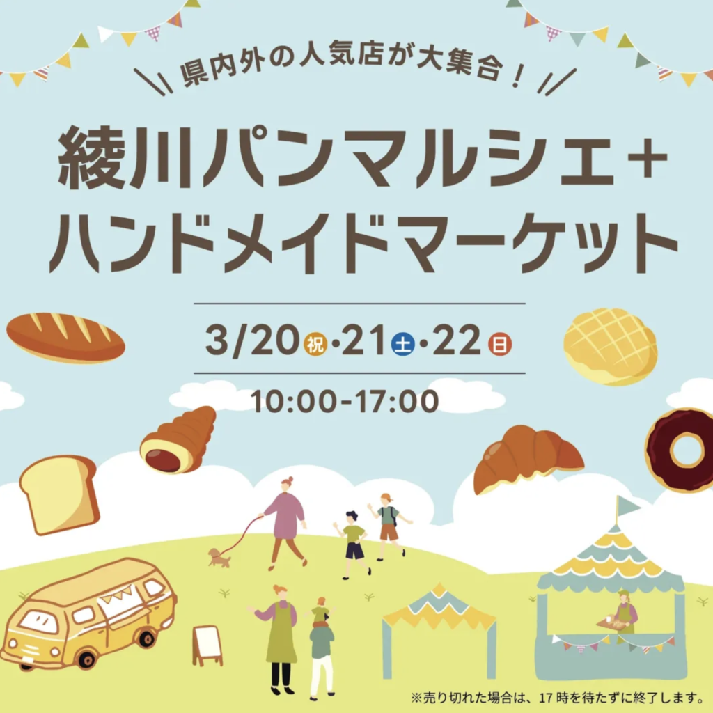 2026.02.25 お知らせ (3/20-22)【香川/綾川町】綾川パンマルシェに出店! この度、香川県綾川町のイオンモール綾川にて開催される「綾川パンマルシェ+ハンドメイドマーケット」に出店します。 カリットカリー他商品をお持ちしますので、この機会に是非お立ち寄りください。