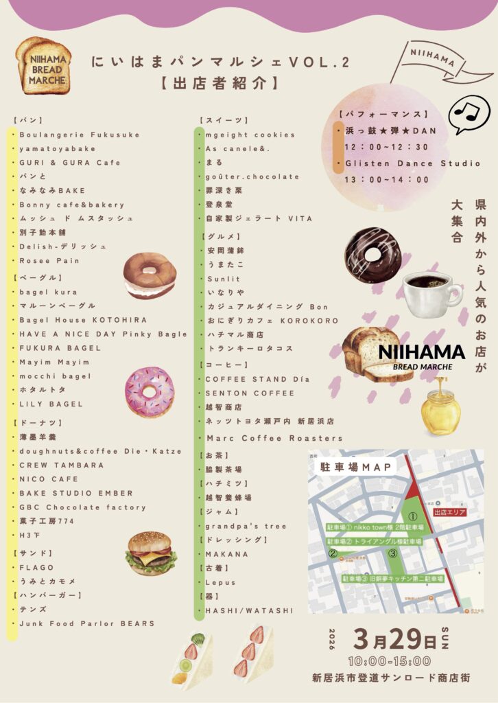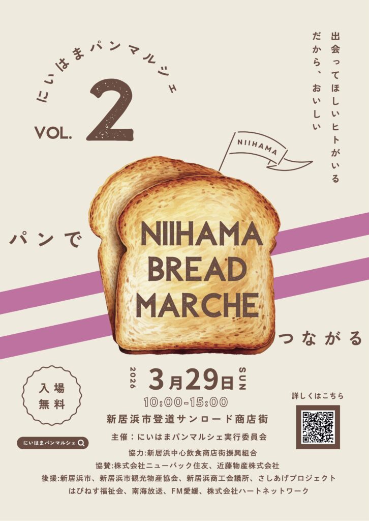 この度、新居浜中心飲食商店街振興組合様をはじめ、多くの皆様のご協力をいただき、新居浜市登道サンロード商店街にて「にいはまパンマルシェvol.2」を開催する運びとなりました。